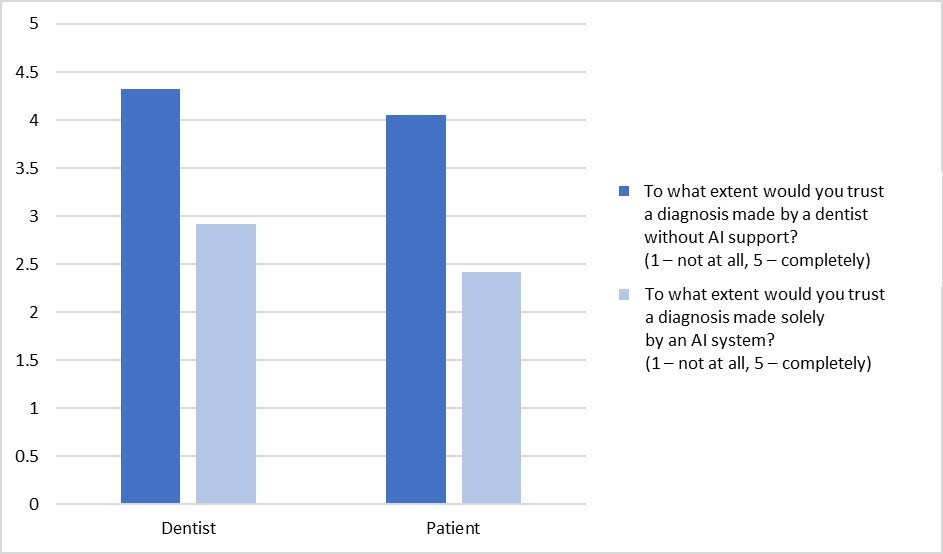 The dental practitioners demonstrated higher trust in AI-supported diagnoses than patients, with mean trust scores of 2.92 versus 2.42, respectively. Trust levels increased significantly along with self-reported knowledge of AI, reaching mean values of 3.20 for “high” and 4.00 for “very high” familiarity. In a hypothetical scenario with equal error rates, 79.21% of respondents would favor a dentist supported by AI, 18.81% preferred human-only care, and only 1.98% would trust AI alone.